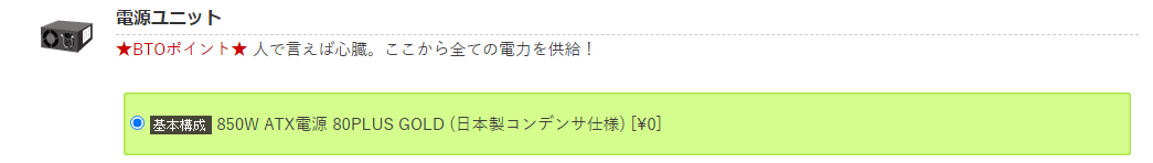 BTOパソコンの場合だと、上記のようにあらかじめ基本構成の電源がセットされていて、モデルやメーカーによってほかの電源も選べます。