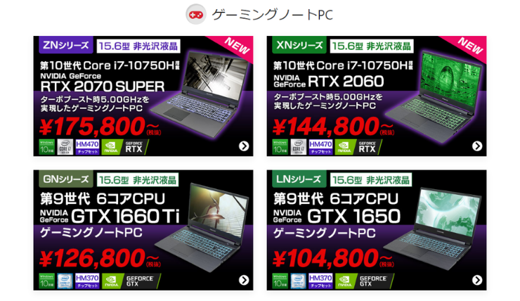 ゲーミングパソコンだけでなく、クリエイターパソコンや、ノート型のパソコンも揃っています。