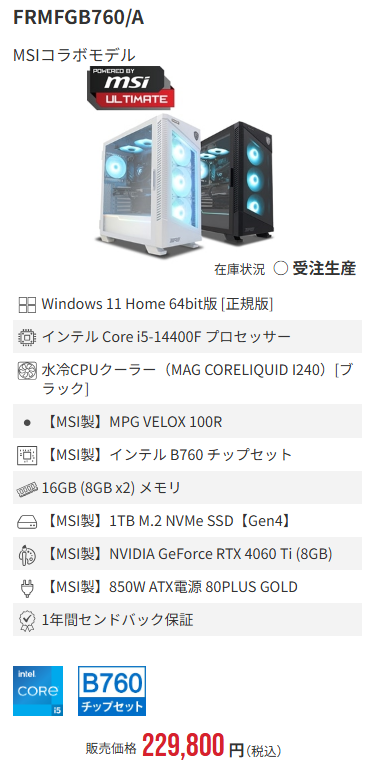 | グラフィック | 【MSI製】NVIDIA GeForce RTX 4060 Ti 8GB |