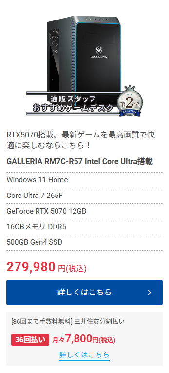 ただみなさん言ってる通り、ドスパラかパソコン工房かマウスコンピューターなどで購入すると良いと思います。