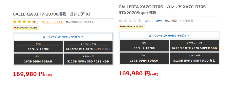 同スペックで旧型のガレリアXFと比較すると、7,100円高いということになります。